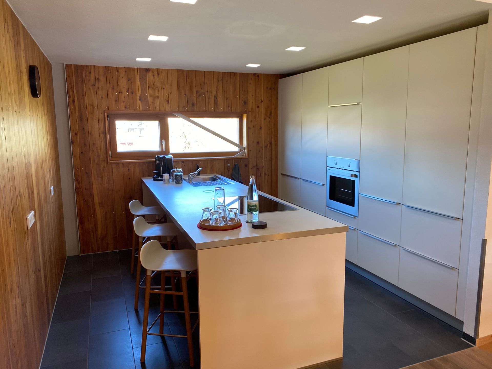 Open, modern fitted kitchen with large kitchen block and counter area IDishwasher, induction hob, oven, microwave, fridge with freezer compartmentIHigh-quality equipment and sufficient quantity: Porcelain dishes, glasses, wine and champagne glasses, cutlery, cookware and cooking utensils, towels, pots, pans, knife block IElectrical appliances: Nespresso coffee machine, filter coffee machine, kettle, toaster, mixer, hand blender IEverything for a beautifully set table: placemats, candle holders, vases, lanterns