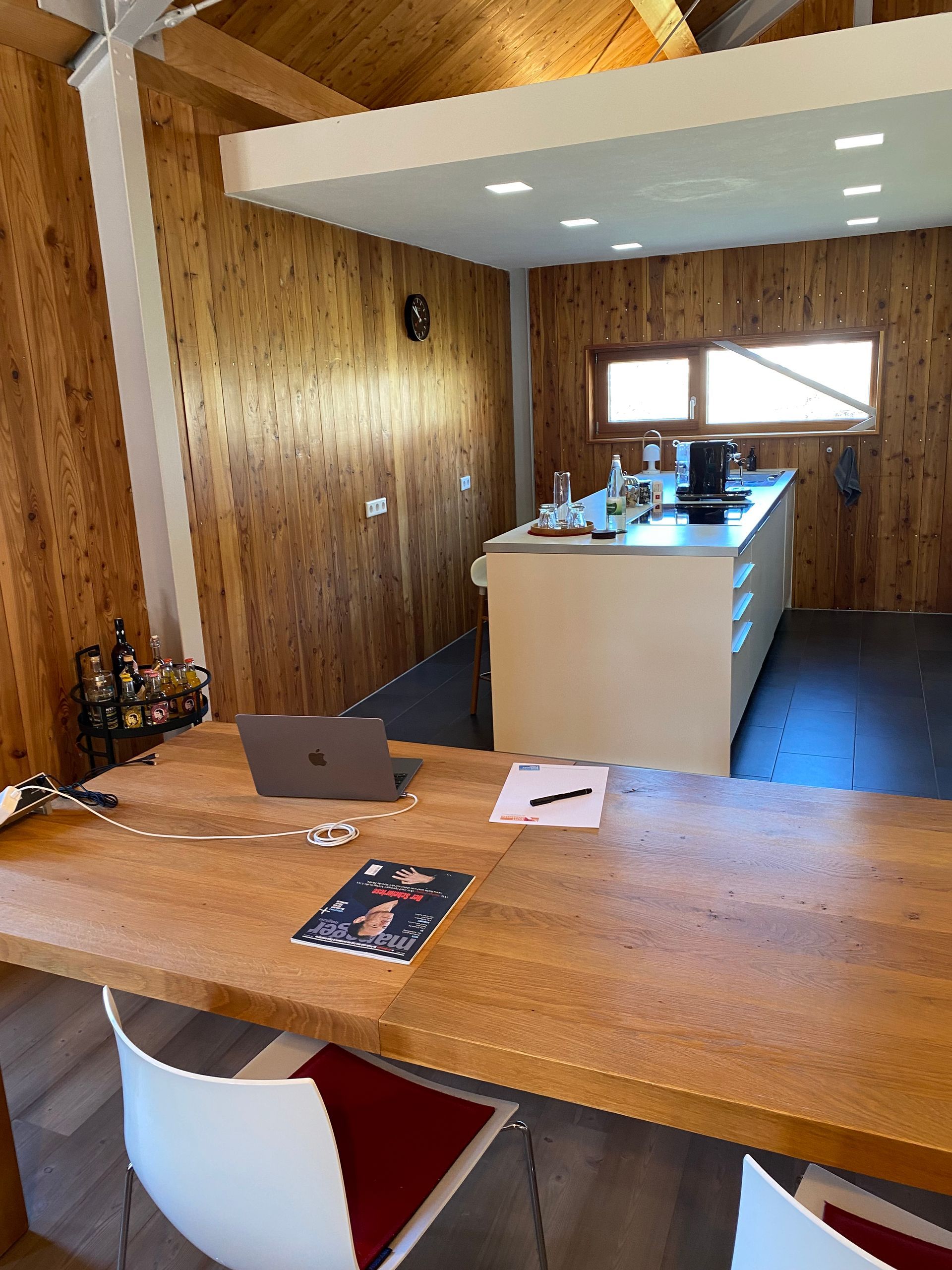 Open, modern fitted kitchen with large kitchen block and counter area IDishwasher, induction hob, oven, microwave, fridge with freezer compartmentIHigh-quality equipment and sufficient quantity: Porcelain dishes, glasses, wine and champagne glasses, cutlery, cookware and cooking utensils, towels, pots, pans, knife block IElectrical appliances: Nespresso coffee machine, filter coffee machine, kettle, toaster, mixer, hand blender IEverything for a beautifully set table: placemats, candle holders, vases, lanterns