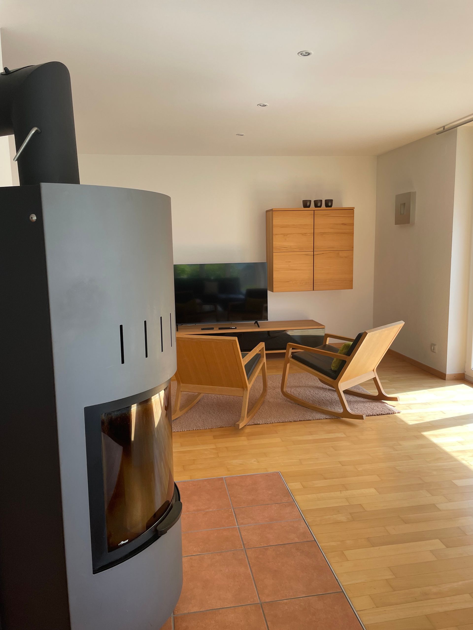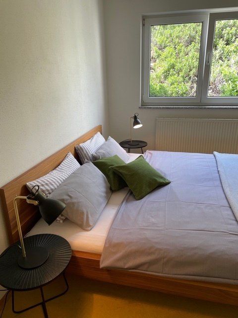 The Sonnenappartement is located in the basement of the Sonnenhaus. The apartment features a bedroom with a large window overlooking the garden and a shower room with a toilet. A seating area is located in the entrance area. The rooms are furnished in new, high-quality, and modern style. Also located in the basement is a sauna and fitness room, which can be booked separately. In addition to a Klafs sauna with infrared functionality, the room is equipped with an exercise mat and relaxation loungers.