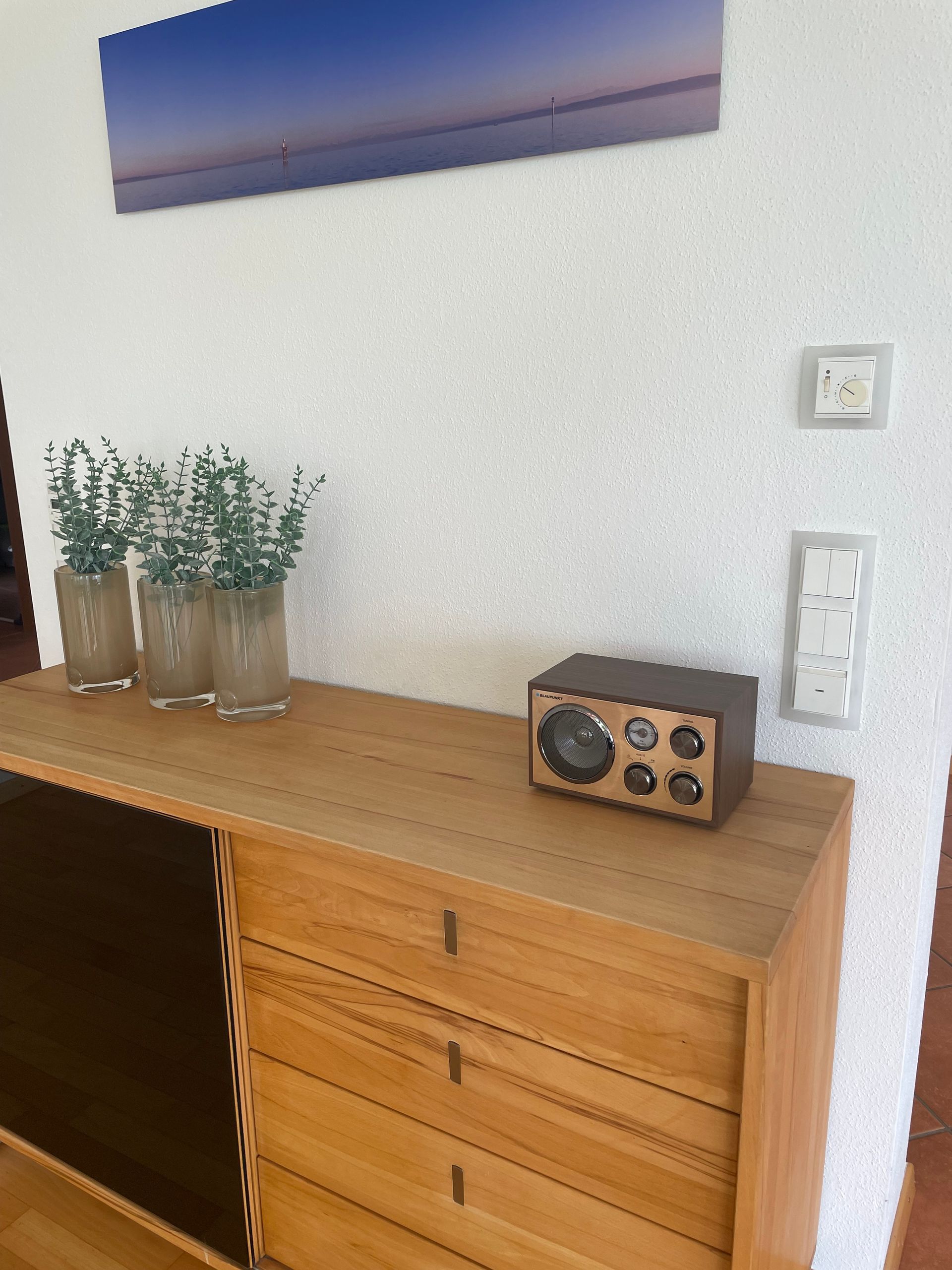 Sleeping in the sunny apartment Double bed with adjustable slatted frames I Allergy-friendly mattresses and bed linen I Shower room with shower and toilet I Large four-door wardrobe I Two chairs, bench and wardrobe for storage I Space for baby travel cot I Bathrobes (on request) I LCD TV with satellite connection I Seating area in the hallway