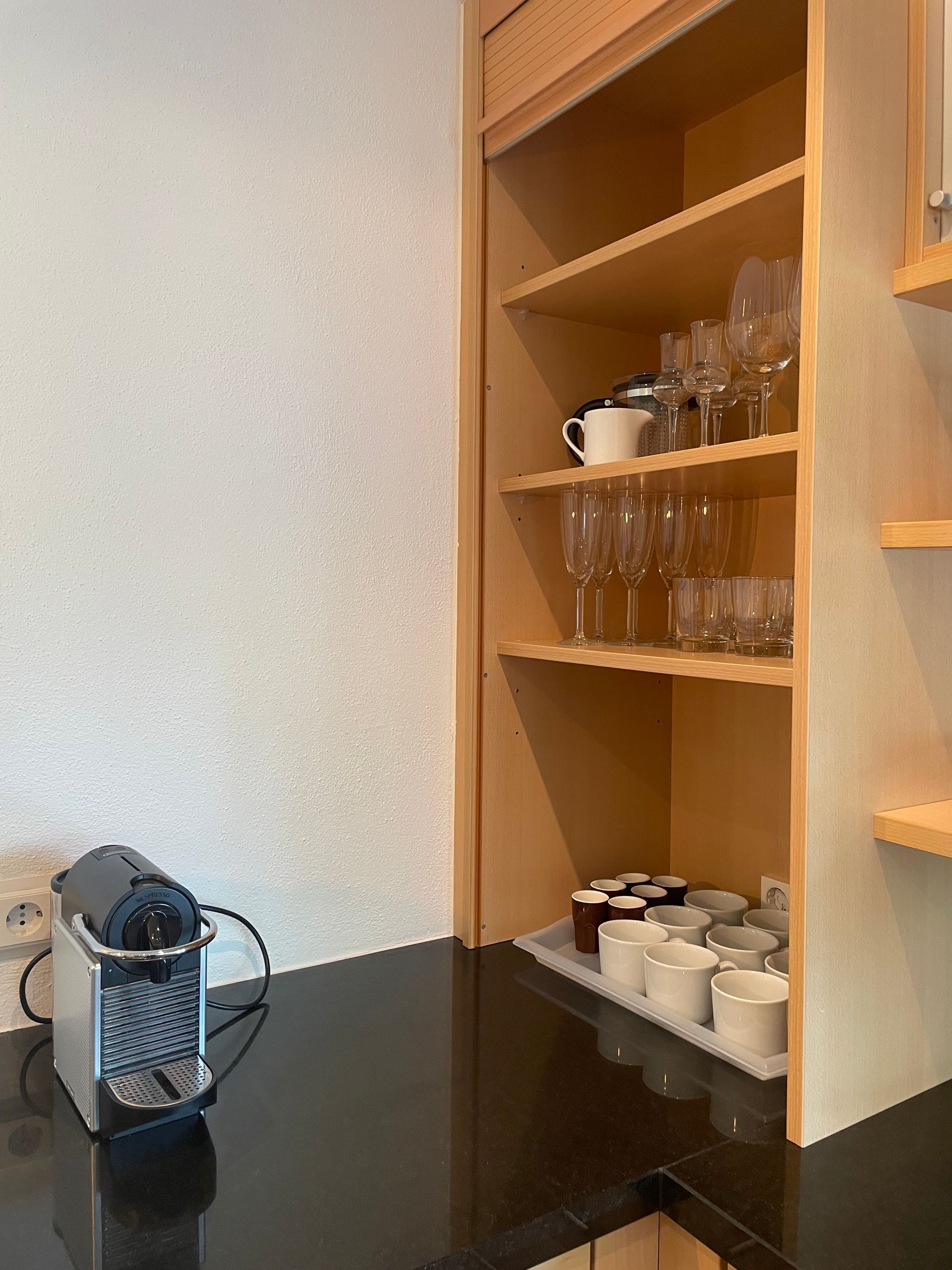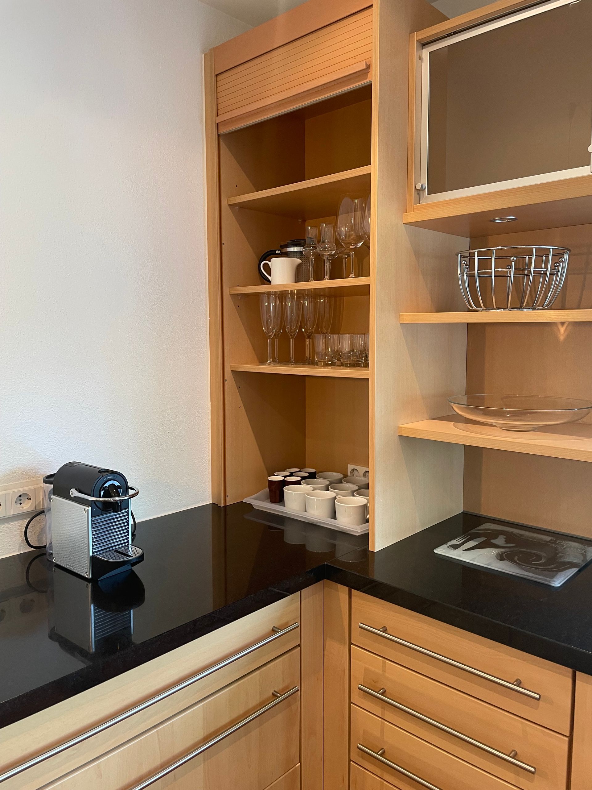 Modern fitted kitchen with large granite worktop and integrated counter area IDishwasher, induction hob, oven, microwave, fridge with freezer compartment, extractor hood IHigh-quality equipment and sufficient quantity: Porcelain dishes, glasses, wine and champagne glasses, cutlery, cookware and cooking utensils, towels, pots, pans IElectrical appliances: Nespresso coffee machine, filter coffee machine, kettle, toaster, mixer, hand blender IEverything for a beautifully set table: placemats, candle holders, vases, lanterns